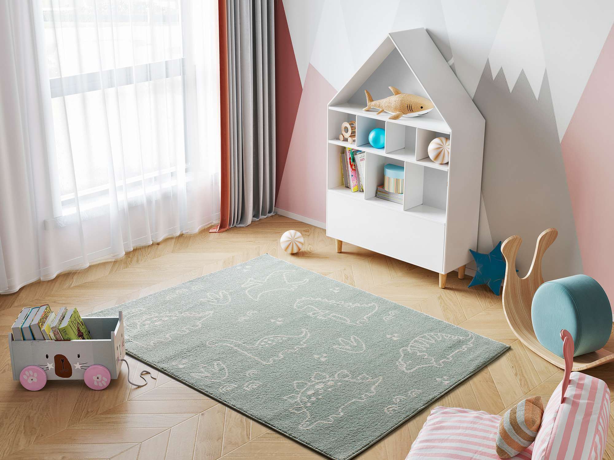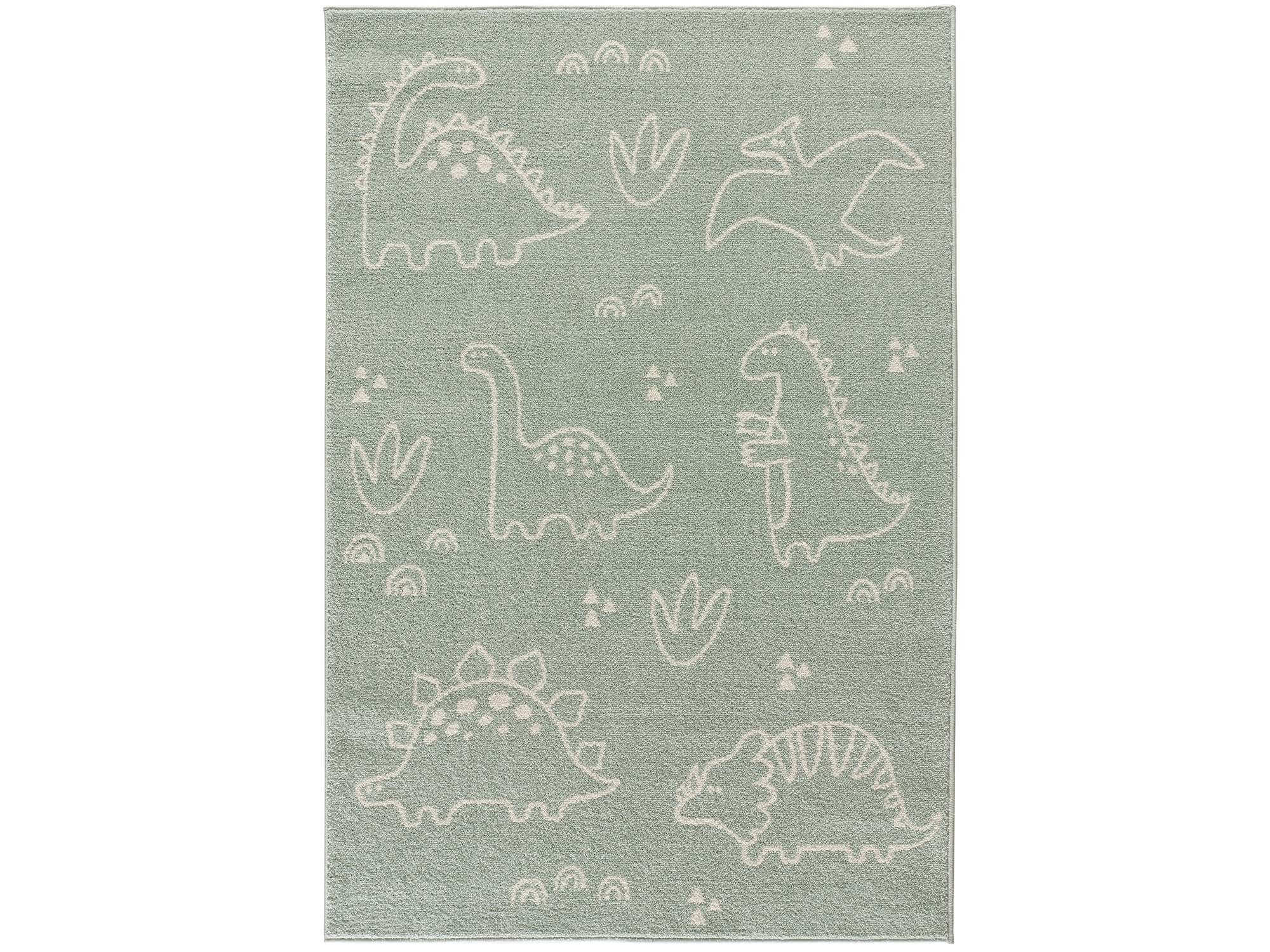 La alfombra infantil Beats 40252 es una opción encantadora y funcional para cualquier espacio destinado a los más pequeños del hogar. Con su fondo verde , esta alfombra presenta un diseño lúdico que seguramente capturará la imaginación de los niños: siluetas de dinosaurios en tonos claros adornan su superficie.