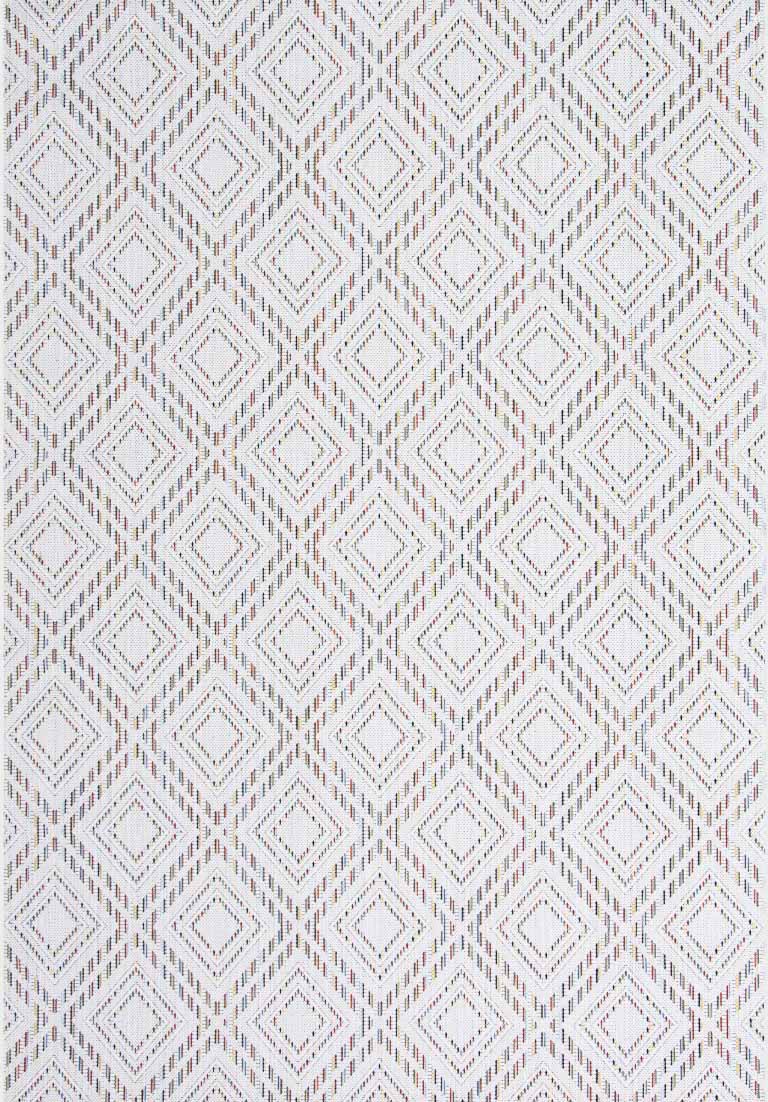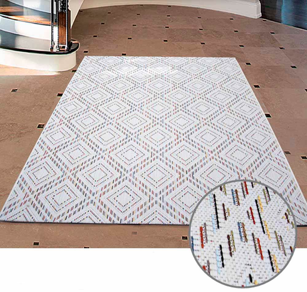 El fondo en color marfil proporciona un lienzo suave y neutro que destaca la esencia del entorno, creando un ambiente acogedor y sofisticado. Los hilos multicolores se entrelazan en un diseño geométrico fascinante, añadiendo un toque contemporáneo y vibrante a tu área al aire libre.
