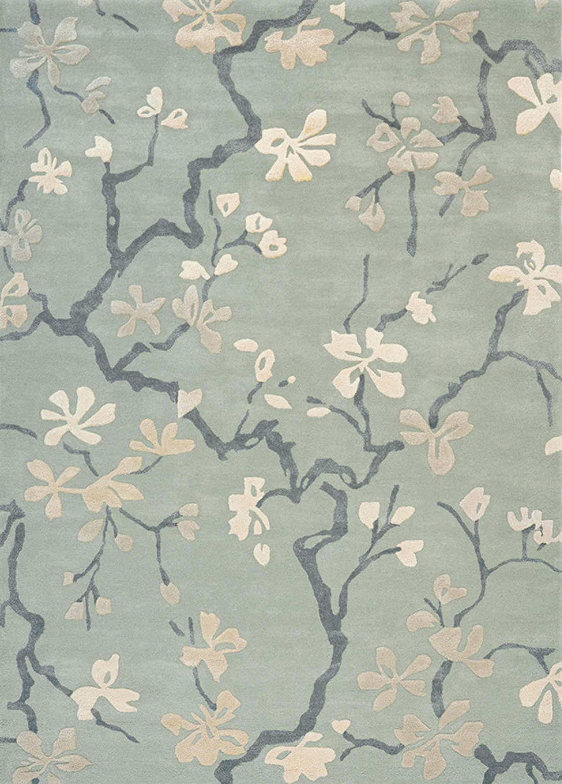 Con su suave y refrescante fondo azul porcelana (China blue), la alfombra Anthea exhibe un diseño exquisito de ramas intrincadas con delicadas flores de cerezo en tonos crudos y beige. Este patrón atemporal, que evoca la belleza de la primavera, aporta una sensación de ligereza y elegancia etérea a cualquier espacio, creando un ambiente de paz y armonía.
